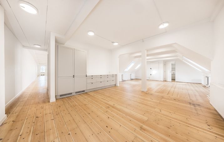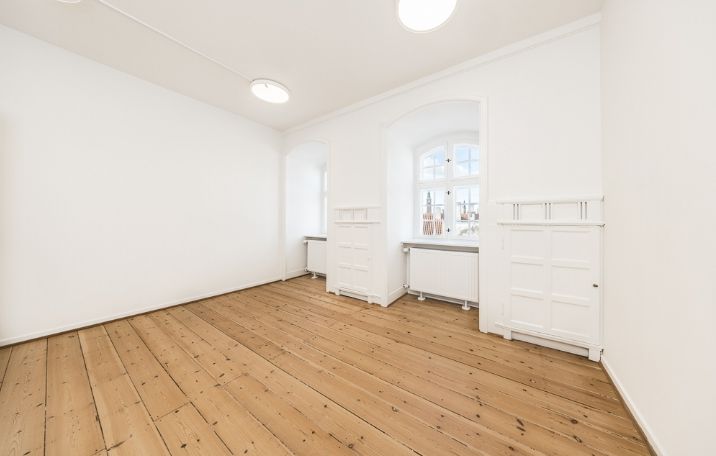 Lejemålet er beliggende på 4. sal og har et historisk og herskabeligt udtryk med mange smukke detaljer.Total istandsat med nybehandlede planke- og sildebensgulve.