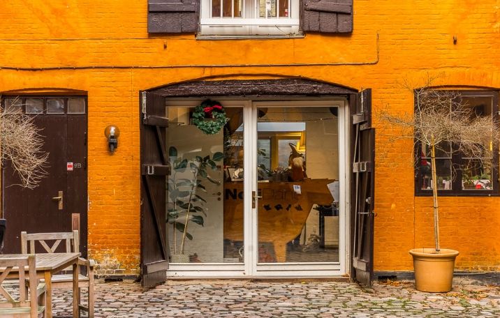 Ejendommen, som kan dateres helt tilbage til 1752, ligger i en smuk baggård med indgang gennem en port via en smuk ældre ejendom mod Amaliegade.