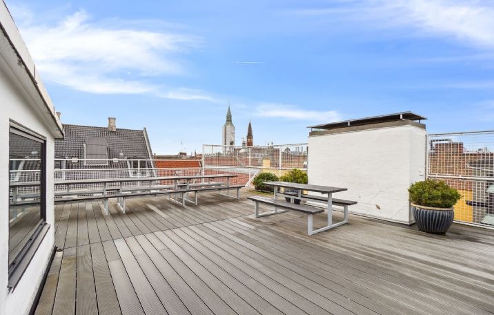 Ejendommen byder desuden på elevatoradgang, cykelparkering i gården samt adgang til en charmerende fælles tagterrasse.